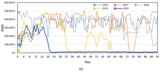 The daily electricity demand (KWh) in Jordan during the movement restriction orders during the ongoing pandemic period over five years: (a) city center; (b) Ashrafiah; (c) Rashadieh.