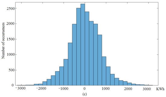 Histogram for the forecast error results of rolling stochastic ARIMAX forecast model with the average demand scenario for (a) monthly, (b) daily, and (c) half-hourly testing period in Jordan (city center).