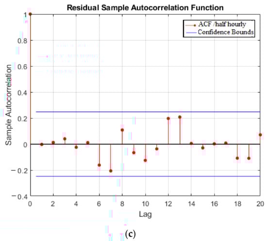 Autocorrelation function (ACF) plots for the forecast error results of rolling stochastic ARIMAX forecast model with the average demand scenario for a (a) monthly, (b) daily, and (c) half-hourly testing period in Jordan (city center).