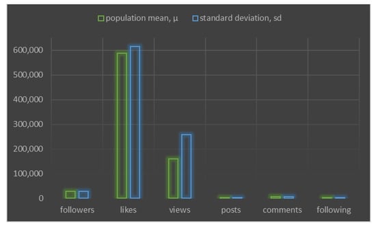 In Figure 5, are statistics for the important social media features of an Instagram profile. The mean values for all the features besides likes and views are considerably low, ranging from 624.5 to 27,703.5 actions. The variation of values of the features is very disperse, meaning that the actions in all features’ categories are spread out. This dispersion depicts the scattered, fragmented, and ad hoc communication and managerial and strategic choices for the MWH sites, as also discussed in the analysis of the findings.