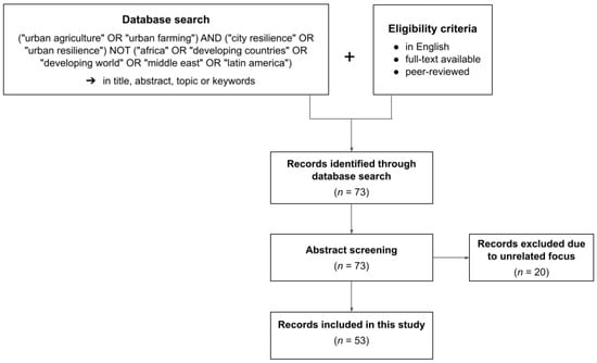 To gain a comprehensive understanding of urban agriculture in the context of city resilience in the global North, a review of the academic literature was carried out. In order to minimise bias and improve replicability, a systematic approach was taken based on predefined criteria for the selection of relevant studies. An overview of the selection process is shown in Figure 1 below. Articles were identified using a combination of keywords connected by Boolean operators (i.e., AND, OR, and NOT), which could appear anywhere in the title, abstract, topic, or keywords of papers. Studies focusing on issues in the developing world and for which full-text was not available in English were excluded. To control for the quality of sources, only publications in peer-reviewed journals were considered. In order to ensure that issues are considered from a range of perspectives, no restrictions on article type, publication date, or journal title were applied.