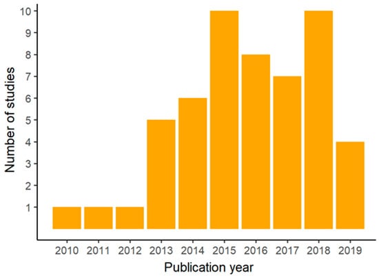 Applying all selection criteria and an initial screening of 73 abstracts (see Methods) resulted in 53 papers to be reviewed for this study. All reviewed papers were published after 2010 (most between 2013 and 2018) (Figure 2), in 39 different journals with focal subjects covering a range of topics (mostly related to sustainability, environmental science, and urban planning and policy, but also public health, geography, architecture, and engineering) (Figure 3). This reflects the novelty and inherently multidisciplinary nature of this research area, and also demonstrates the breadth of research that fed into the conceptual model we present in this study.