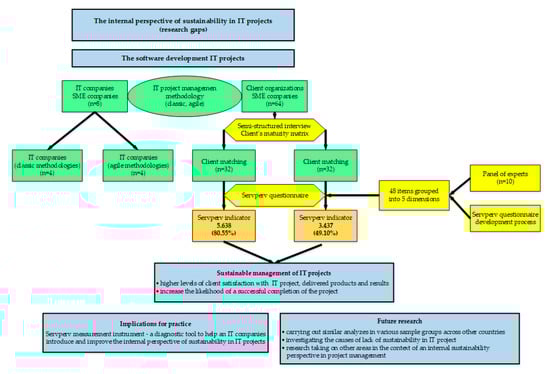 The combination of the above gaps shows the need to build a bridge between IT project management and sustainability—an internal perspective of sustainability in project management relating to the client. The internal perspective of sustainability in project management is related to the project management processes and areas, along the project life cycle []. The choice of methodology is a key aspect that determines the entire course of an IT project and the production of its products.