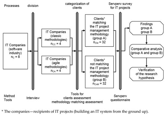 To verify the proposed hypothesis, the clients’ satisfaction with the IT project, its products, and results were examined. The clients were divided into two groups: group A—clients matching the IT project management methodology used, group B—clients not matching the IT project management methodology used.