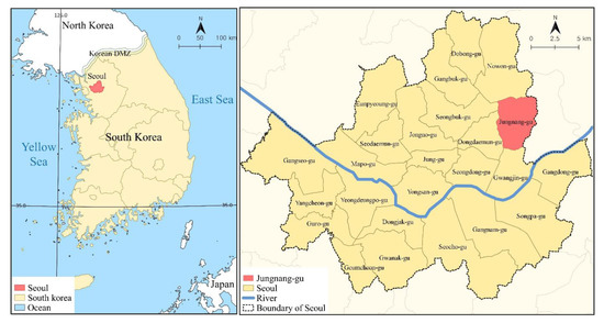 This study takes one of the 25 districts in Seoul as an example to explain the method in detail. We selected the Jungnang-gu district, one of the most aged districts in Seoul. Jungnang-gu is located on the outskirts of the northeastern end of Seoul (Figure 1) and has an area of 18.50 km2; moreover, it has 16 sub-regional administrative areas. The percentage of buildings over 20 years accounts for 80% of all buildings, and 43% are over 30 years old. The population of Jungnang-gu has decreased from 427,964 in 2010 to 397,015 in 2019, with those aged 65 or older accounting for about 16% of the total population [34].