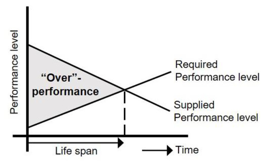 Building performance continues to deteriorate with time once the building begins to be used and is affected by differing conditions such as climate, use, and the quality of the building itself [1]. Several studies regard building age as an important indicator of the deterioration of buildings and their components [40,41,42]. The performance level of the building decreases over time, while the supplied performance level increases. “Overperformance” is a period when the supplied performance level is higher than the required performance level. This overperformance period becomes the life span of the building (Figure 2). The building age must be measured to examine how close the building is to its life span. This serves as an important indicator of which areas are underdeveloped.