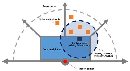 Before setting the research criteria, three assumptions must be considered based on the role of buildings that affect urban areas in terms of the key issues of TOD and urban regeneration. First, local services should be located around transit centers, such as rail stations and bus stations, based on the concept of TOD and to achieve high-density development. In addition, the areas in which local services are located around transit centers should be within walking distance to provide a pedestrian-friendly urban environment. Second, residential buildings cannot change their usage. Third, commercial buildings can change their usage or add various other forms of usage. To create a mix-used land environment, it is recommended that commercial buildings be used for multi-functional purposes. However, it is not easy to change the usage of residential buildings. We assume that the purpose of residential buildings populated by people cannot be tampered with.