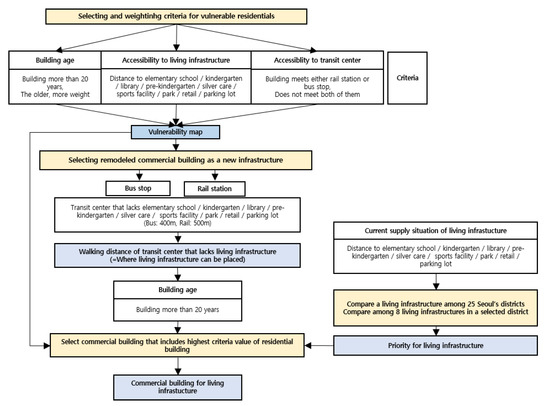 For residential buildings, Shannon’s entropy method is used to calculate the relative difference in the index value of buildings in the district, which is the quantified value of each criterion corresponding to a building, to measure how vulnerable the building is for each criterion. If a certain building has a higher index value than other buildings, a higher weight is calculated. Then, the value of the criterion can be measured by multiplying the index value by the weight value. In addition, the summation of the criterion value of residential buildings can generate vulnerability maps after normalizing and becomes an indicator to determine the criterion value of a commercial building. It can calculate how many residential buildings have a high value of weight around a commercial building. Then, a commercial building that includes the highest criterion value of a residential building is selected as a suitable building to provide public services. This process is applied to each public service. If the selected commercial building has the possibility of supplying more than one public service, the weight is also assigned to eight public services. To calculate the weight of public services, we investigated residential buildings that do not satisfy the minimum standard of accessibility to the eight public services, and this approach was applied to 25 districts in Seoul. The value was represented by the number of residential buildings that lack public services for each infrastructure type and district. Simpson’s index was then used to assign priority to each public service (Figure 4).