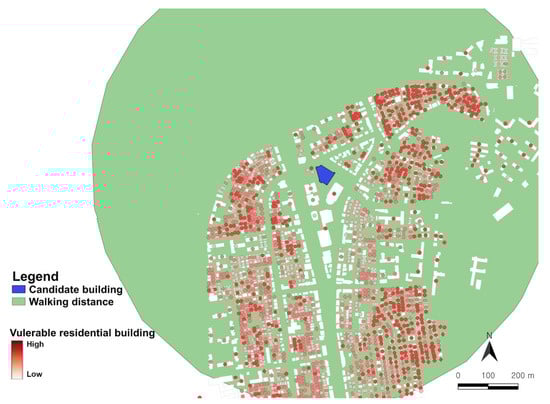 Next, results were obtained by generating a layer of very suitable candidates among commercial buildings for each public service. If the decision-maker wants to narrow down the candidate building, a natural break can be applied among very suitable buildings for each infrastructure. A total of 17 commercial buildings were selected as the final candidates for public services (Table 5). This table shows the candidates for each public service, the number of residential buildings that the candidate building covers, and the percentage of diminution of blind spots of public services. Each program for public service has candidate buildings, and a building number is assigned to each candidate building. The number of residential buildings shows the number of vulnerable residential buildings that the candidate buildings cover without consideration of the weight value. When candidate buildings are supplied, the environment of vulnerable residential areas till the area within walking radius is improved. The percentage of diminution of vulnerable residential buildings shows the ratio of improved residential buildings to the overall vulnerable residential buildings. The number of residential buildings that a candidate building covers with consideration of the weight value is represented as the summation of the weight value. According to the summation of the weight value, the priority of the candidate buildings is assigned. The order of the decision-making process is conducted by the priority of each infrastructure.