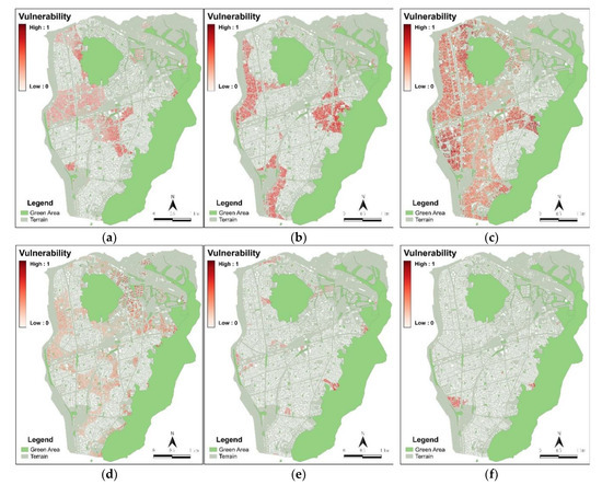 Vulnerability map of residential buildings in Jungnang district: (a) elementary school, (b) kindergarten, (c) library, (d) pre-kindergarten, (e) social welfare, and (f) sports.