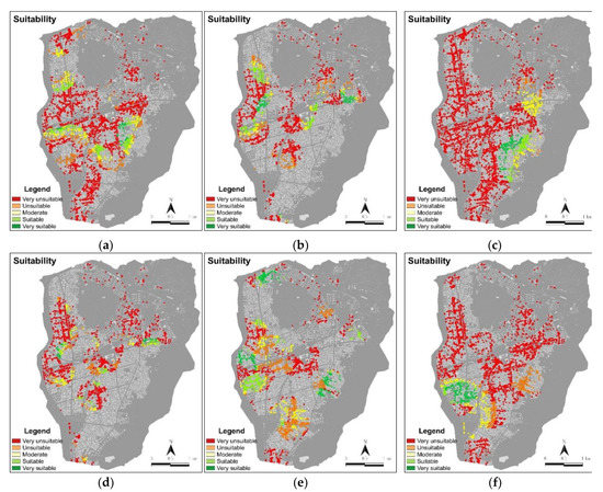 Suitability map of residential buildings in Jungnang district: (a) elementary school, (b) kindergarten, (c) library, (d) pre-kindergarten, (e) social welfare, and (f) sports.