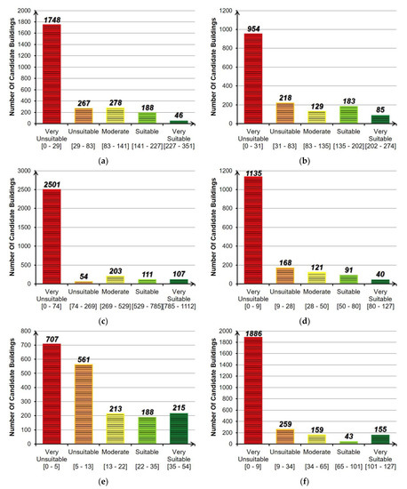 Using the vulnerability value maps of residential buildings, the final suitability map of commercial buildings candidate for public services was drawn, as shown in Figure 7. The higher suitability values of commercial buildings indicate that they cover a higher number of residential buildings that lack public services, which means that commercial buildings have a greater possibility of being candidates for supplying public services. The final map was classified into five categories—very suitable, suitable, moderate, unsuitable, and very unsuitable—using a natural breaks classification. The rate of five categories for each public service was measured to select suitable candidate buildings. The number of each category is shown in Figure 8.