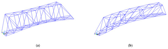 Using the design documentation, a 3D FE model of the steel truss bridge is established in ANSYS software (Figure 3a). All the components are modeled by the same element type BEAM 188. Totally, 186 nodes and 136 elements are used and the connections of the members are regarded as rigid. The cross-sectional and material properties of the bridge components are listed in Table 1. The first four mode shapes (two lateral bending, torsional, and vertical bending modes) of the bridge in the healthy condition are shown in Figure 4.
