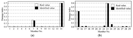 In multiple damage Cases 5 to 8, double or triple damage is introduced into a substructure. The detailed identification results of each case and the iterative process of Case 7 are shown in Figure 19 and Figure 20, respectively, while Table 7 presents a comparison of the real and identified values. The following conclusions can be drawn from the above results: