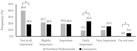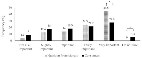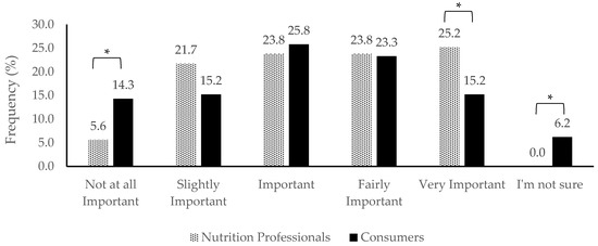 Importance of the Health Star Rating of PBMAs between nutrition professionals and consumers (* Chi-Square tests using Bonferroni adjustments—within group differences (z score ± 1.96)).