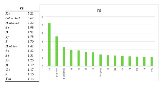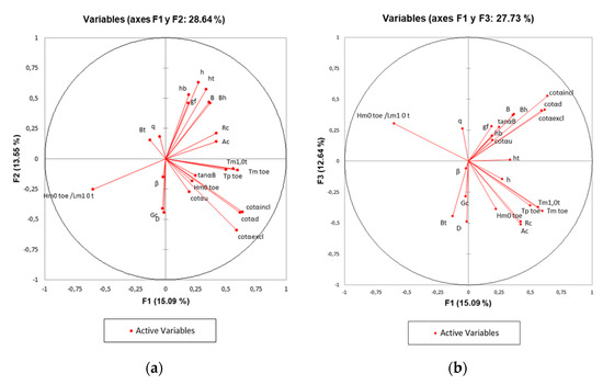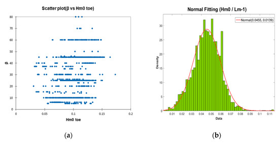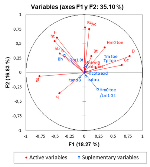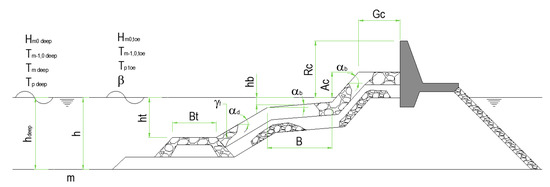 The hydraulic parameters related to the wave field proposed are: the spectral significant wave height offshore and at the toe of the structure (Hm0 deep; Hm0), the mean spectral wave period offshore and at the toe (Tm−1,0 deep; Tm−1,0), the average and peak period offshore (Tm,deep; Tp,deep), the peak period at toe of the structure (Tp,0), and the wave incidence angle (β). The structural parameters, considered to geometrically define the structure: the water depth offshore (hdeep), the water depth in front of the structure (h), the water depth at the toe of the structure (ht), the width of the toe berm (Bt), the width of the berm (B), the berm submergence (hb), the slope of the structure downward of the berm (cotαd), the slope of the structure upward of the berm (cotαu), the average co-tangent, considering the contribution or not of the berm and the slope (cotαincl; cotαexcl), the slope of the berm (tanαb), the crest freeboard of the structure (Rc), the armour crest freeboard of the structure (Ac) and the crest width of the structure (Gc), and finally among the structural parameters, those related with the armour elements characterization, like the permeability/roughness factor of the armour layer (γf) or the size of the structure elements along the slope (D).