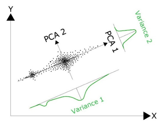 PCA consists of finding orthogonal transformations of the original features to obtain a new set of uncorrelated ones, called Principal Components. These uncorrelated features are the eigenvectors, and are obtained in decreasing order of importance, this importance being associated with the amount of variance explained by them. As a result, the components are linear combinations of the original features and it is expected that only a few (the first of them) will capture most of the variability of the data, thus obtaining a reduction in size after the transformation that this technique involves [53]. Geometrically, transformation can in fact be explained as a rotation in the p-dimensional space (see Figure 2), looking for the projection that maximizes the information provided by the multivariate pattern in terms of variance.