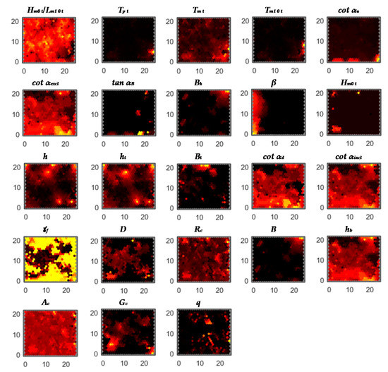 In another way, the application in this case of a Kohonen network model, also indirectly allows the interpretation of existing relationships at the level of self-similarity. Information that will ultimately allow decisions to be made on reducing the dimensionality of the input space with topology preserving [54], either by interpretation of these detected relationships between the variables, or by confirmation of those already detected using the PCA technique. This is achieved through the interpretation of the distance matrix (U-matrix), and significantly, of the plane components (P-Matrix) [55]. The U-matrix represents in a 2D lattice the Euclidean distance between neighboring nodes. The component planes allow the graphic display, also in 2D, of each of the variables in the data set, by expressing the values of the weight vectors.