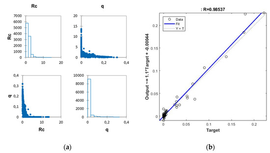 Results on the selected model for the optimum specific range for wave overtopping conversion: (a) Vertical freeboard (Rc) vs. overtopping rate relationship in the model sample; (b) Correlation graph for the Rc/Hs < 1 specific range.