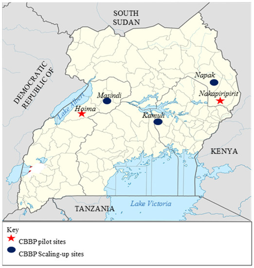 Map of Uganda showing CBBP pilot and scaling-up sites.