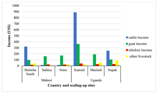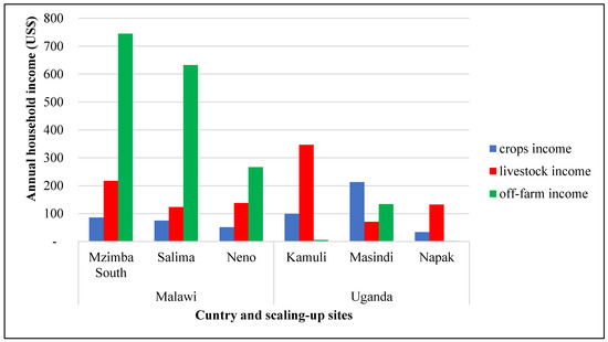 Figure 3 shows the contribution of agricultural and off-farm activities to the annual household income. The contribution of agricultural and off-farm activities to the annual household income is diverse in the two countries. Major factors influencing the trends include proximity of the study area to towns and trading centers and varying agro-ecological conditions. For instance, Napak and Kamuli lie in the cattle corridor which stretches from southwestern to northeastern Uganda, characterized by arid and semi-arid conditions and dominated by pastoral rangelands; hence, livestock (mainly indigenous) is the chief source of income and livelihoods. The agro-ecological conditions in Masindi are favorable for crop production characterized by average small land-holding and flock sizes. Hence, crop production is the main source of income and livelihoods. The study areas in Malawi are located close to major trading centers; hence, livelihoods are mainly supported by off-farm income consisting of salaries and wages (37%), small businesses (30%), remittances (19%), and casual work (13%). Excluding income from off-farm sources, the contribution of livestock is consistently high across the study areas.
