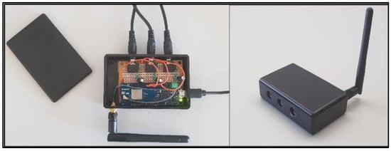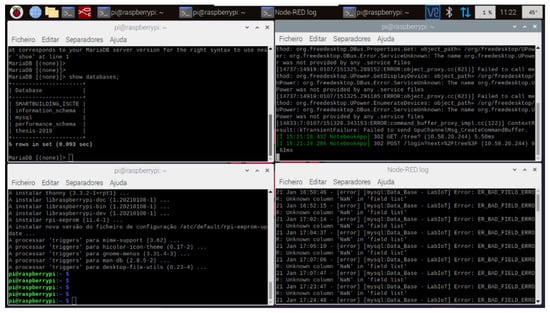 The application server is responsible for receiving data from the LoRa server and processing it. For this purpose, a Raspberry PI (Figure 7), installed on ISCTE-IUL’s internal network, with a RaspbianOS operating system, was configured to run a local web server using [51]. This server has the function of processing JSON type messages received via TTN carrying the data packets of the installed sensors. It then creates corresponding SQL entries according to the type of sensor and sends them to a [52], a flexible, open-source SQL database type, stored locally in the same Raspberry Pi. The data collected by the sensors were structured in individual tables in a SQL database for later analysis, query, and export. Figure 7 shows the server operation screen with all functional applications and the system log open.