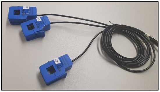 The main reasons for choosing the TC sensor SCT-013-000 were the reduced costs, ease of implementation in prototype, high reading accuracy, the existence in the laboratory of several units ready for testing, and the experience gained from previous projects. The size of the TC sensor was also one of the main parameters when choosing this transformer because in most cases, the switchboards are not prepared to receive sensors, and there is little available space. Another factor that facilitates the implementation beyond the size is the shape of the TC sensor, a clamp, easy to open and close, which means that it can be opened and installed around the cable. In the case of the current sensors, it was decided to supply external power. This decision was based on three different factors: first, they were installed in a place where current is available; second, they needed to be small to fit safely in some of the cabinets; and third, they must have much higher sampling frequency than the environmental sensors, meaning that they consume much more power.