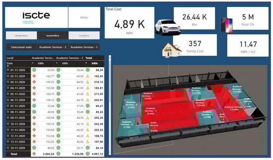 In this work, one of the forms of data representation consisted of using an interface based on a BIM model. This approach allows laypeople to have a better understanding of the environmental comfort where they are located as well as simplifying the levels of energy consumption to a series of colorimetric scales, which allows the users to identify the areas and time where the biggest consumptions occur.