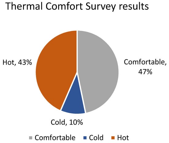 Figure 12 presents the user’s thermal perception results collected from the performed survey. From the collected perceptions, 43% classified the room environment as usually hot.
