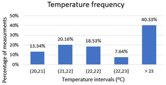 From Figure 14, we can observe that from temperature measurements collected every 10 min from the beginning to the end of the process, 40% of those were above 23 °C. Based on the user’s perception of the environment, the presented results indicate that 40% of the time, the open-space was overheated and therefore, energy could have been saved if air conditioning units were properly programmed.