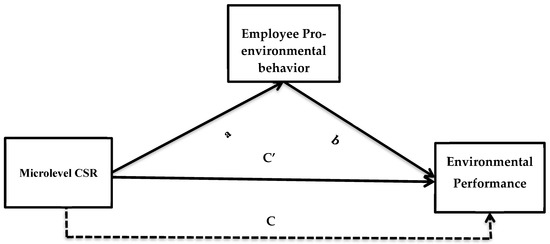 Proposed research model: This figure is drawn based on the authors’ conception; the relationships between the variables are drawn based on relevant literature. There are three variables in the above research model, among which microlevel CSR is the independent variable, environmental performance is the dependent variable and employees’ proenvironmental behavior is the mediating variable. C′ = indirect direct effect of X on Y with the effect of the mediator; C = direct effect of X on Y without the mediator; a = direct effect from microlevel CSR on employee environmental behavior; b = direct effect from employees’ proenvironmental behavior on environmental performance.