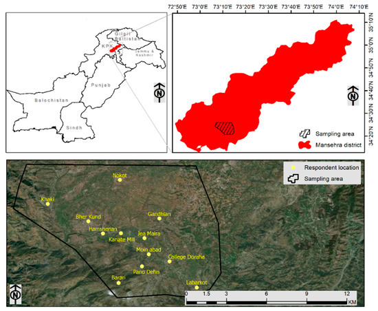 The study was conducted in Mansehra District, NW Pakistan, from January to March 2020 (Figure 1). The district occupies an area of 4579 square kilometers, consisting of mainly plains and hills. Mansehra is located between 34°14′ and 35°11′ latitude and 72°49′ and 74°08′ longitude. Mansehra District is surrounded by lush green high mountains and plain agricultural land. Mountain elevation varies between 2000 m in the South to over 4500 m in the North. In Mansehra, the climate is moist temperate: the mean maximum and minimum temperatures recorded are 34 °C and 2 °C, respectively.