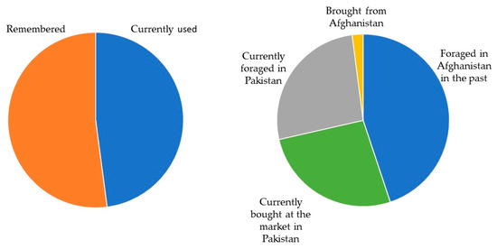 Most of the quoted ingredients were only remembered (Figure 3), while most of the quoted plants were foraged (during the past in Afghanistan and currently in Pakistan), although an important number—especially dried wild herbal teas—were bought from markets in the host country. The most frequently quoted ingredients were wild amaranth (Amaranthus spp.), Berberis lyceum, ajwain (Trachyspermum ammi), spotted medick (Medicago arabica), and psyllium (Plantago ovata).