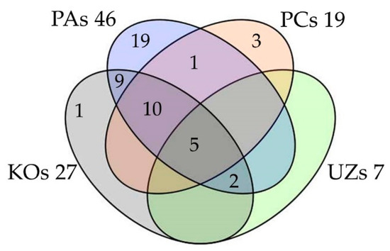 Figure 4 and Table 3 show the overall comparison of the wild plant ingredients quoted by the four considered groups, in which we can observe that the diversity of wild plant ingredients quoted by Pashtuns living outside the camps (n = 46, 25 currently used) was much higher than that of wild plants quoted by Kochis (n = 27, 11 currently used), by the Pashtuns living in refugee camps (n = 19, 9 currently used), and by Uzbeks (n = 7, 6 currently used). In particular, the JI between PAs and KOs overall wild ingredients was remarkable and higher (JI = 0.55) than that between both Pashtun groups (JI: 0.36).