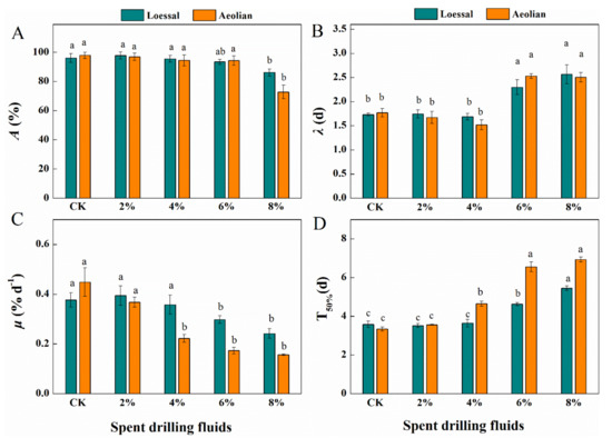 Germination kinetics of maize seeds exposed to spent drilling fluids. Maximum germination (A); the length of the lag phase (B); germination rates present by germination percentage per day (C); the time for 50% germination (D). Each data is presented as mean ± SD (n = 5). Different lowercase letters in each column represent significant differences within the same soil at the p < 0.05 level, based on Tukey’s Honestly Significant Difference (HSD) Test.