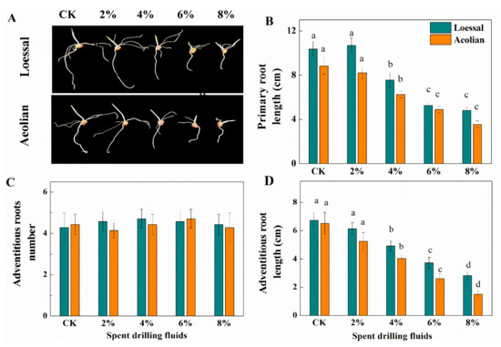 Alternatives for the disposal of drilling fluids, including chemical stabilization and solidification, use in construction, or transport to an approved landfill, were used in the oil and gas industry in China. Compared to other disposal options, land reclamation is a relatively effective and attractive strategy for managing the drilling fluids [10]. This process is used to treat and/or dilute the potentially harmful constituents (petroleum hydrocarbon, soluble salts, and/or plant-available trace metals) contained in SDFs. In addition, the use of SDFs for land reclamation is a practical and cost-effective way to improve soil fertility and decrease landfills. There are few studies addressing the impacts of SDFs on plant growth, which includes plant biomass, grain yield, nutrients, and trace elemental uptakes in plant tissue. Bauder et al. (1995) showed that SDFs applied at controlled rates were beneficial to the growth of sorghum and maize by increasing the Fe and Zn concentrations in plant tissues [11]. Bauder et al. (2005) showed that a single application of SDFs at rates up to 94 Mg ha−1 did not affect wheat yield compared to a negative control [12]. Zvomuya et al. (2011) demonstrated that soluble nutrient elements, such as N, P, and Mg in above-ground plant tissues increased with increasing loading rate in samples taken 45 days after SDFs application [13]. Yao et al. (2014, 2015) showed that twice-used SDFs significantly increased barley above-ground biomass, and all SDFs treatments increased the available potassium relative to that in the control [14,15]. Despite studies investigating the effects (negative and/or positive) of SDFs on various crops, comprehensive data on the underlying mechanism are limited, and the effects on the early growth of crops remain unclear. In agriculture, seed germination and early seedling growth are the two critical stages for the establishment of crops, and plants are highly sensitive to abiotic stressors, such as salinity, heavy metals, polycycle aromatic hydrocarbons [16,17,18,19,20]. The disruption of germination and/or seedling establishment indirectly affects plant yield, and a delay or reduction in plant emergence can affect final productivity. While land reclamation can be a relatively effective and promising option for the management of SDFs, the direct exposure of seeds to chemical agents in SDFs is a potential risk. Therefore, a comprehensive understanding of early seedling growth would establish a reference point and facilitate management decisions to optimize land applications of SDFs.