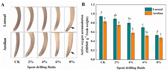 Spent drilling fluids significantly increased (p < 0.0001, Table 3) ascorbate peroxide (APX; F = 10.993), peroxidase (POD; F = 48.438), superoxidase (SOD; F = 26.316) activity in primary roots. Soil type significantly affects the POD and SOD activity but not the APX activity. POD and SOD activity in primary roots grown in loessal soil was lower than in aeolian soil (F = 18.236, p = 0.0004; F = 12.195, p = 0.0023; respectively), whereas APX activity did not differ between the two soils (F = 0.009; p = 0.9246). SDFs significantly increased the content of proline in root samples (F = 131.357, p < 0.0001), and the proline content was lower in samples grown in loessal soil than in those grown in aeolian soil (F = 22.625, p = 0.0001; Table 3). The root proline content increased by 3.02-fold in loessal soil and by 3.69-fold in aeolian soil after exposure to 8% SDFs, compared with untreated samples.