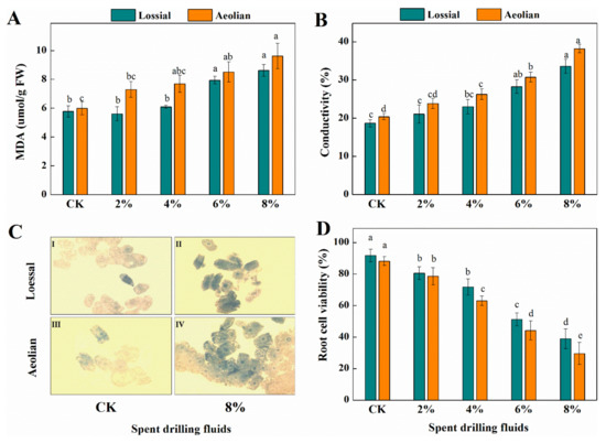 In addition to their role as signal transduction molecules, ROSs are considered toxic byproducts of stress metabolism and can oxidize lipids, thereby causing cell death. The radical-induced peroxidation of the lipid membrane is both a reflection and a measure of stress-induced damage at the cellular level [44]. Lipid peroxidation (degradation) increases in plants under stress conditions because of the rapid generation of ROSs [45]. Increased membrane lipid damage and the concomitant increase in MDA content can alter the intrinsic properties of the membrane, such as fluidity and permeability, and the alteration of membrane integrity may lead to a loss of cell viability [46]. In the present study, higher concentrations of SDFs (≥6%) significantly increased the MDA content of plants grown in both soils (Figure 4A). Membrane permeability, as indicated by electron conductivity, increased considerably in maize roots treated with 8% SDFs in both soils (Figure 4B). The root cell viability, which was determined using the trypan blue exclusion method, decreased by 40.78% and 50.31% after exposure to 8% SDFs, compared with untreated roots, in loessal and aeolian soils, respectively (Figure 4D). The increased MDA and membrane conductivity and decreased cell viability in samples may be related to the enhanced lipid peroxidation caused by SDFs-induced ROS generation.