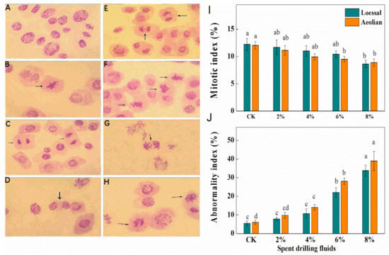 The cytogenetic effects of SDFs are listed in Figure 5. Spent drilling fluids caused strong inhibition in the mitotic index (MI), with a statistically significant difference in relation to the control, and the decrease in the MI was correlated with the increasing concentrations of SDFs (F = 10.167, p = 0.0001; Figure 5I). Treatment with 8% SDFs caused a 29.42% and 26.24% decline in MI in roots grown in aeolian and loessal soils, respectively. Chromosomal anomalies, including stickiness and bridges, were observed at most stages of mitosis in the presence of SDFs (Figure 5A–H). Chromosomal abnormality in roots increased significantly in response to SDFs (F = 4.352, p = 0.008; Figure 5J). The abnormality index (AI) was 33.77% and 38.95% for loessal and aeolian soils, respectively, in roots treated with 8% SDFs. Untreated root tips showed <6% abnormalities in both soils. There were no significant differences in AI between SDFs-treated samples in the two soil types (F = 1.258, p = 0.275).