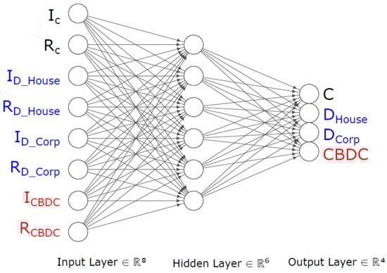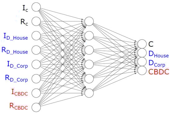 The next step is the introduction of CBDC, which represents a disruptive event in the system. Figure 4 represents a simple framework to analyze the wealth transfer amongst financial assets when introducing CBDC. This system allows the testing of different CBDC designs including interest rate set at positive, negative or zero levels as well as potential limits to the holdings of CBDC per account. In particular, the difference between the previous model and this one is the introduction of the element CBDC, which is represented by two new inputs and a new output. The DNN is designed with eight inputs, a hidden layer composed of six nodes and four outputs. This is the scenario that has been used as an example in the results section, as we describe later.