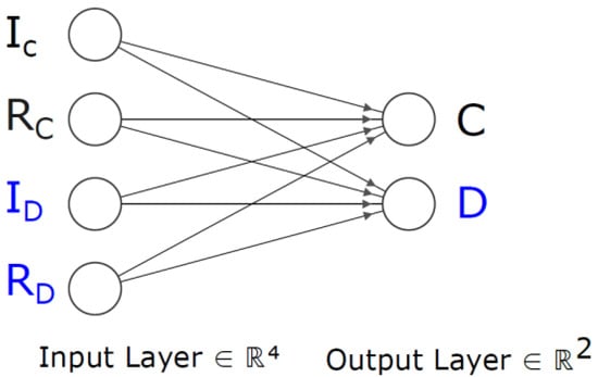 The model proposed is composed of four elements: (i) Cash, (ii) Household commercial bank deposits, (iii) Corporate commercial bank deposits, and (iv) CBDC. This model uses two key characteristics of a financial asset as inputs: (i) Interest (or expected yield), and (ii) Risk (or expected volatility), while the outputs represent the allocation of the total wealth of a closed economy between the different elements or financial assets mentioned above. The elements of the model and the number of inputs per element can be easily expanded following the same logic as presented later in this work. The model assumes a closed economy, with citizens and businesses having direct claims against the Central Bank when holding CBDC. Figure 1 shows a visual representation of the model, assuming only one commercial bank in the system, where the outputs are: