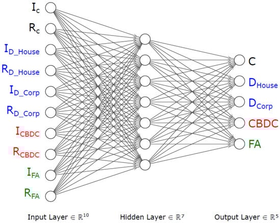 In this study, DNN is used as a multivariate regression model to learn the mapping function between the input vector, which in our case is composed of the interest and risk parameters of each one of the financial assets, and the output vector, which are the final weights or amounts allocated to each one of the financial assets given the interest-risk pairs for each asset. Figure 1, Figure 2, Figure 3, Figure 4, Figure 5 and Figure 6 show an example of the proposed architectures. Color code used in the figures below is black for Cash, blue for Deposits, red for CBDC and green for other Financial Assets.