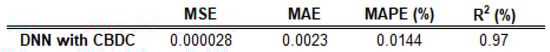Finally, the mean squared error (MSE), the mean absolute error (MAE), the mean absolute percentage error (MAPE), and the coefficient of determination (R2) were calculated and tabulated to evaluate the performance of the model.