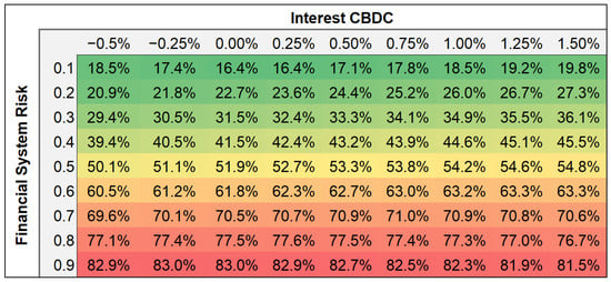 Finally, Figure 11 shows the transfer, mainly of commercial bank deposits given that cash remained broadly unchanged, to CBDC. The results shown in the matrix below represent the total volume of CBDC as a percentage of the total wealth. The colour code also shows the risk of a digital bank run, given that in some scenarios the total holdings of CBDC could reach as high as ca. 80% of the total.