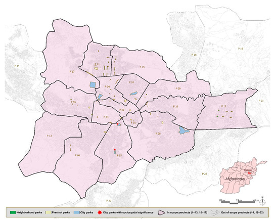 Kabul City has 65 functioning public parks occupying a total of 309 ha [63,64]. By adopting the previously discussed four categories of urban park area standards and The Greenery Department of Kabul Municipality proposal (see the results in Table 1), the three categories of this classification can be demonstrated. Figure 1 illustrates the location of existing parks in Kabul City’s precinct plan.