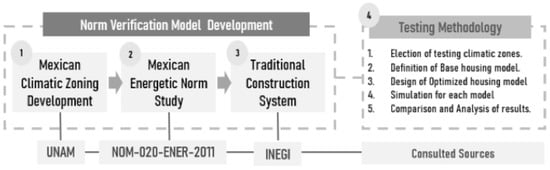 Creating a new model of energy verification for Mexico seems to be a complex project. Our principal research aims were the development of a model for verifying the model’s compliance with the Mexican standard and conducting a comparison with the Energy Plus simulation model for testing the benefits of including thermal comfort analysis in the verification model. For a new scheme, profound studies are required to support the coefficients and reference values of the standard. For practical purposes, the use of an actual verification method was suggested, but with the customization of several issues. Due to the lack of an international regulation code at the time (2010), the actual energy standard NOM-020-ENER-2011 was developed using the practices and guidelines quoted in publications, like the ASHRAE (American Society of Heating, Refrigerating and Air Conditioning Engineers) Fundamentals Manual, 1998 and 2001 editions. The standard presents its own method of verification, pursuing energy savings by controlling the thermal envelope heat transfer with a mathematical calculation method [13]. So, as a first approach for a new verification model, new reference values were researched and created. To obtain the planned results of the initial hypothesis, the working plan was divided into four stages, as displayed on Figure 1: (1) The development of climatologic zoning of Mexico according to its different climatic severities; (2) the study of Mexican energy standard NOM-020-ENER-2011 and its application; (3) constructing a traditional building system catalogue for the country; (4) the development of an energy testing exercise with the previous materials and tools, applied for the selected social housing model. The fourth stage, the testing exercise, was used to test if the existing model complied with the standard. If not, improved models for each climatic zone were developed until standard compliance was achieved. Finally, for verifying the applicability of energy efficiency strategies on different traditional construction systems, a comparison test was performed.