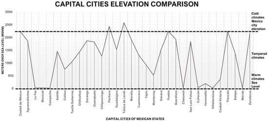 Comparison of Mexican capital cities elevations, and the relationship of elevation with cold and warm climates. The coldest climates are located on mountains and at high elevations, whereas the warmest climates are located at low elevations close to sea level.