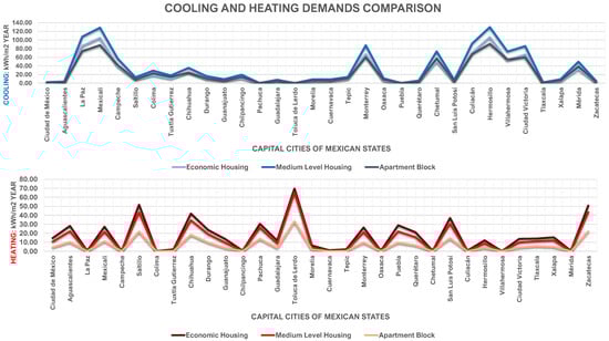 Cooling and heating comparison for each of the housing model types, showing that medium-level housing registered the highest cooling demands in all climates. Economic houses registered the highest heating demands; however, scaling the results, the heating demands are lower (70 kWh/m for the highest value) than the cooling demands (125 kWh/m for the highest value).