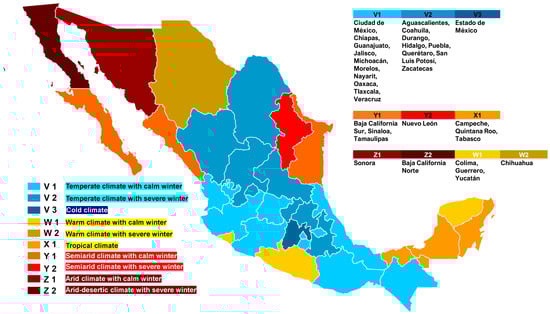 The ten climatic zones were divided in three groups. The first group corresponds to cold and temperate climates, containing V1, V2, and V3 zones. The V zones contain the majority of the national territory, except for Estado de Mexico, which has the coldest climatic conditions in the country. This group has a temperature range of 0 to 21 °C 73% of the time [24]. The next group corresponds to warm and tropical climates, containing W1, W2, and X1 zones. The W and X zones are located in states next to the Pacific Ocean (Michoacán and Colima), and Yucatan Peninsula. This group presents a temperature range from 21 to 27 °C 40% of the time, and from 27 to 38 °C the other 40% of the time [24]. The last group corresponds to arid and desert climates, containing Y1, Y2, Z1, and Z2 zones. The Y zones are located in the northern coastal states (Baja California Sur, Baja California Norte, Sinaloa and Tamaulipas, and Sonora) and Nuevo León. This group presents a temperature range from 27 to 38 °C 50% of the time, and temperatures higher than 39 °C the 10–20% of the time [24].