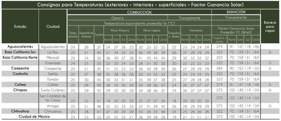 For the second aim of the methodology, we conducted an extensive search and review of the existing Mexican energy standard. Notably, there is no mandatory energy standard in Mexico. This situation is common for North America. In the United States, for example, some states have regional regulations that include an energy performance test. Others states only incorporate energy strategies in their own construction codes. The American energy codes rely on ASHRAE guidelines and reference values. In Mexico, there are some energy guidelines and a group of non-mandatory standards [25]. For this project, we used NOM-020-ENER-2011, published by the National Committee for the Efficient Use of Energy (CONUEE) [3]. With voluntary application, this norm uses the comparison of energy savings for a normal case and a saving-based case as its principal verification method (designed by the optimization of the thermal envelope of buildings and the heat gains analysis). The verification calculation begins with the definition of a reference model for the building using reference values (provided by attached tables and an application manual contained in the standard’s documentation). The next step is the calculation of the same variables, but from the projected model for the building. This information is obtained by analyzing the building geometry and consulting the available data on the plans and material catalogue for the project [7].